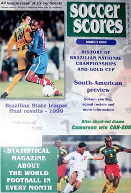 Opis: Drugi numer wydawanego przez węgierskich statystyków i historyków piłki nożnej magazynu "Soccer Scores" z marca 2000 roku, w którym zamieszczono wiele interesujących materiałów i opracowań statystycznych dotyczących światowej piłki nożnej. W tym numerze znajdziemy między innymi bieżące tabele z rozgrywek ligowych w Europie i Ameryce Południowej z sezonu 1999/2000. To także tabele krzyżowe wyników, rezultaty meczów z poprzedniego miesiąca (ze składami w przypadku mocniejszych lig). Ponadto w przypadku niektórych lig zamieszczono skarby kibica ze składami drużyn oraz informacjami o klubach (m.in. Portugalia, Argentyna, Kolumbia, Chile, Peru). W magazynie znajdziemy też tabele i wyniki mistrzostw stanowych Brazylii 1999, bieżące tabele i wyniki meczów ligowych z krajów strefy CONCACAF, Afryki, Azji oraz Oceanii, historię mistrzostw Brazylii z lat 1987-1998 (tabele poszczególnych faz i końcowa, skład i wyniki wszystkich meczów mistrzowskiej drużyny), statystyczne podsumowanie 100 lat historii klubu Bayern Monachium, historię mistrzostw CONCACAF z lat 1941-1989 (wyniki, tabele) oraz Gold Cup CONCACAF 1991-1998 (wyniki, składy, tabele), wyniki eliminacji do piłkarskiego turnieju na Igrzyskach Olimpijskich Sydney 2000, oraz bieżące wyniki meczów reprezentacji narodowych oraz klubowych turniejów międzynarodowych z całego świata. Wszystkie teksty w magazynie są napisane w języku angielskim.