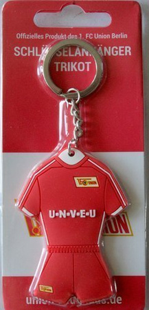 Opis: Wydany przez klub piłkarski 1. FC Union Berlin, wykonany z gumy, plastiku i metalu pamiątkowy brelok w kształcie stroju piłkarskiego w barwach tego klubu. Brelok jest w stanie bardzo dobrym, fabrycznie zapakowany.