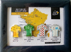 Opis: Jest to oficjalny produkt organizatorów wyścigu kolarskiego Tour de France. Fabrycznie zapakowany zestaw zawiera 4 odznaki emaliowane mocowane na pin z wizerunkiem koszulek zwycięzców głównych klasyfikacji wyścigu, umieszczone za szkłem w ramce z podstawką. Są to: żółta koszulka zwycięzcy wyścigu (Geraint Thomas), zielona koszulka lidera klasyfikacji punktowej (Peter Sagan), biało koszulka dla najlepszego młodzieżowca (Pierre Latour), oraz biała koszulka w czerwone grochy dla zwycięzcy klasyfikacji górskiej (Julian Alaphilippe).