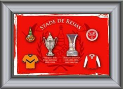 Opis: Oficjalny, zamieszczony w oszklonej ramce do powieszenia na ścianie zestaw 6 dużych i efektownie wyglądających odznak Stade de Reims. Dwie odznaki to herb historyczny oraz obecny, dwie kolejne to repliki trofeów (Puchar Francji, Mistrzostwa Francji), dwie ostatnie natomiast to odznaki-koszulki (historyczna oraz współczesna). Wszystkie są mocowane na pin.