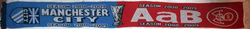 Opis: Wykonany techniką komputerową, dziany dwustronny szalik wydany z okazji dwumeczu w Lidze Mistrzów Manchester City - Aalborg BK, rozegranego w sezonie 2008-09. Widnieją na nim napisy oraz loga obu klubów.