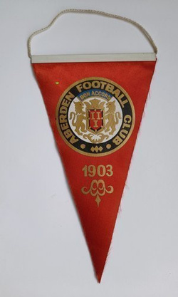 Stan: DOBRY Ślady używania na proporczyku Opis: Wykonany z materiału pamiątkowy proporczyk szkockiego klubu piłkarskiego Aberdeen FC wydany w latach 70. lub 80. XX wieku. Na jego drugiej stronie widnieje flaga Wielkiej Brytanii.
